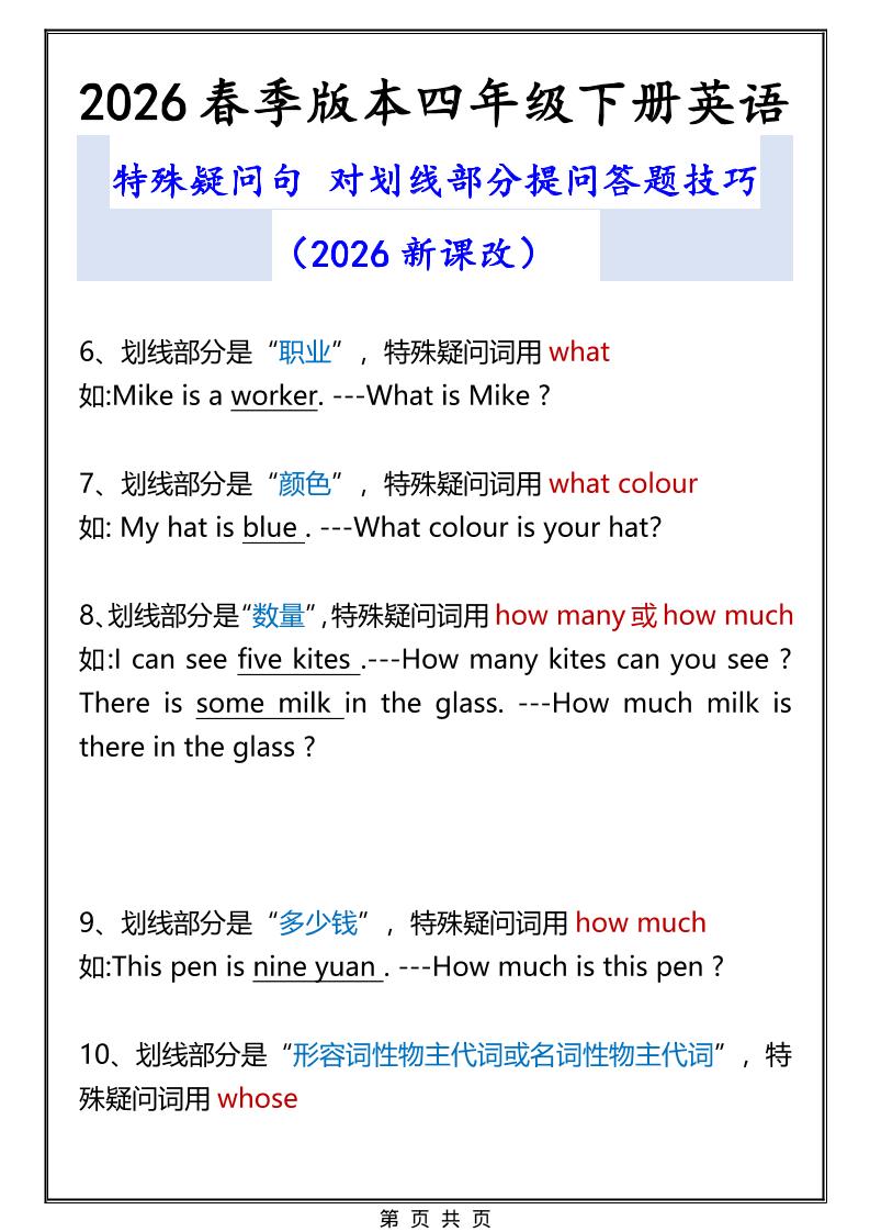 2026春新版四年级下英语特殊疑问句答题技巧站长1小时前更新关注私信02733566 ——预览已结束,还剩1页未读——您已获得此文档下载权限,请点击底部下载完整文档 2026春新版四年级下英语特殊疑问句答题技巧此内容为付费资源,请付费后查看¥4.9黄金会员¥2.9钻石会员免费立即购买您当前未登录!建议登陆后购买,可保存购买订单付费资源已售 48© 版权声明 版权声明 1 本网站名称:皮皮网创网 2 本站永久网址: https://www.pipihai.com/ 3 本网站的文章部分内容可能来源于网络,仅供大家学习与参考,如有侵权,请联系皮皮进行删除处理。 4 本站一切资源不代表本站立场,并不代表本站赞同其观点和对其真实性负责。 5 本站一律禁止以任何方式发布或转载任何违法的相关信息,访客发现请向皮皮举报 6 本站资源大多存储在云盘,如发现链接失效,请联系我们我们会第一时间更新。 7 本站采用知识共享署名-非商业性使用-相同方式共享4.0国际许可协议进行许可 THE END英语 喜欢就支持一下吧点赞566 分享QQ空间微博QQ好友海报分享复制链接收藏